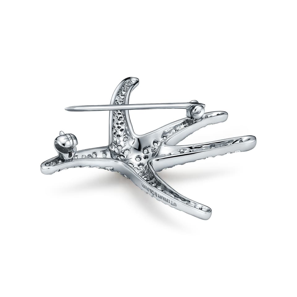 The starfish evokes life beneath the waves and in the celestial heavens. Brooch in platinum with pavé diamonds.